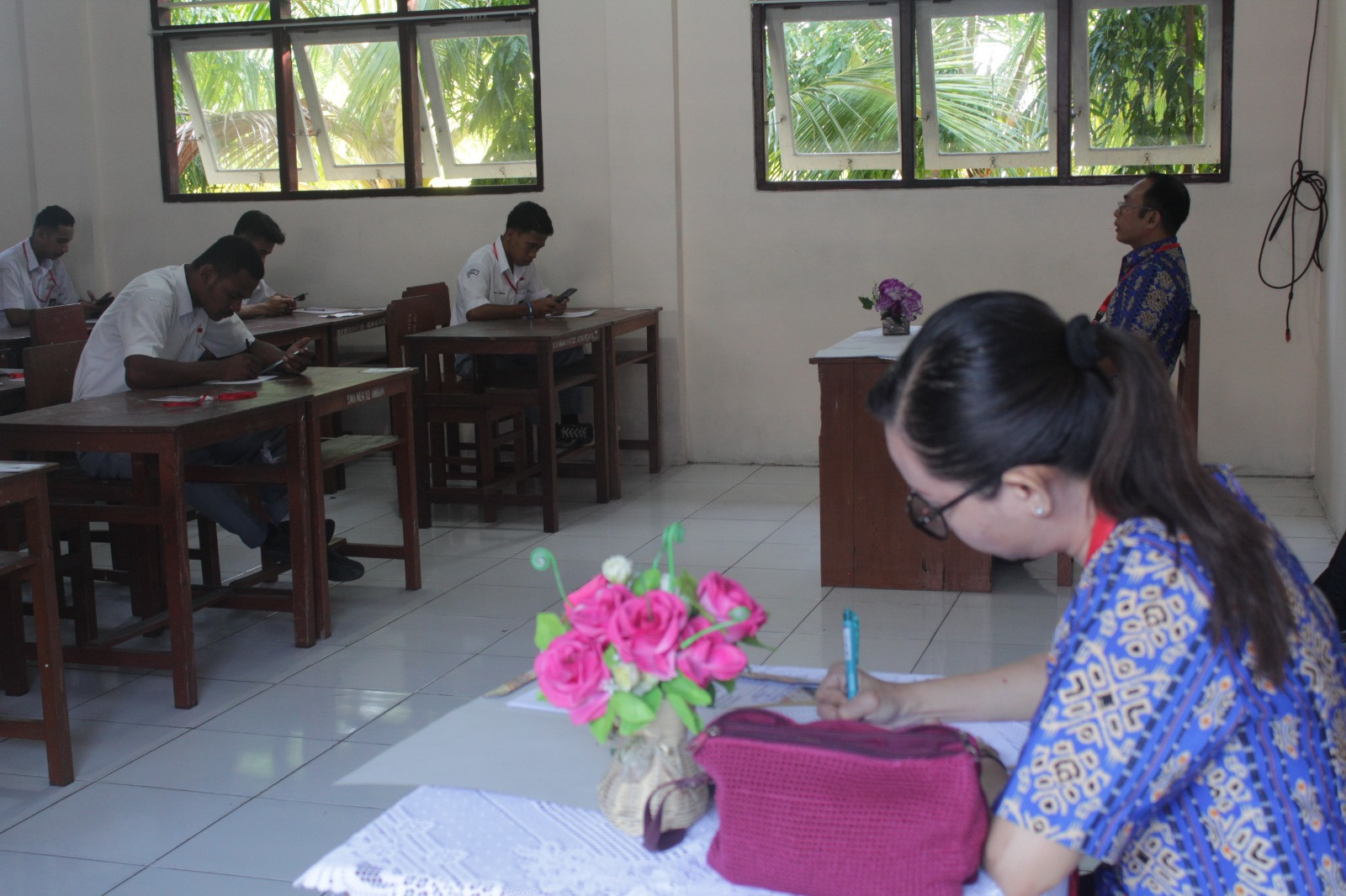 Peserta Ujian Sekolah SMA Negeri 12 Ambon yang sedang diawasi oleh pengawas ujian, Kamis (7/3)