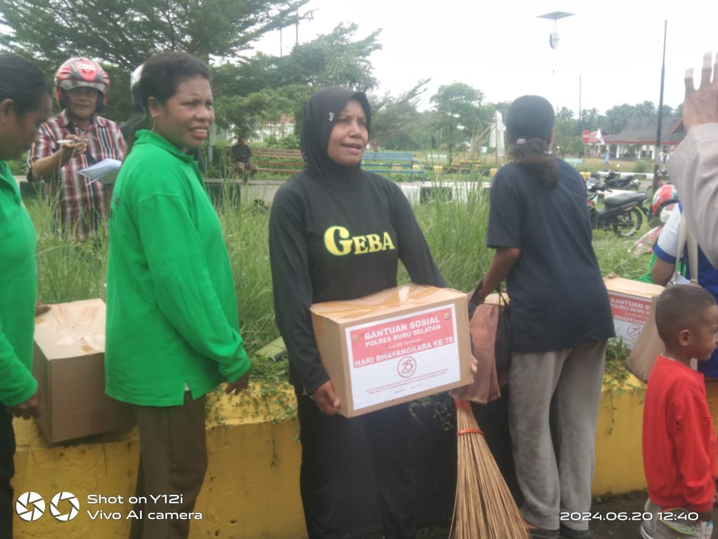NAMROLE,AT-Dalam rangka Hari Ulang Tahun Bayangkara ke 78, Kepolisian Resor (Polres) Buru Selatan menyalurkan bantuan sosial berupa Sembako kepada masyarakat tukang ojek, penyapu jalan, masyarakat penyandang disabilitas (SLB) hingga warga kurang mampu.