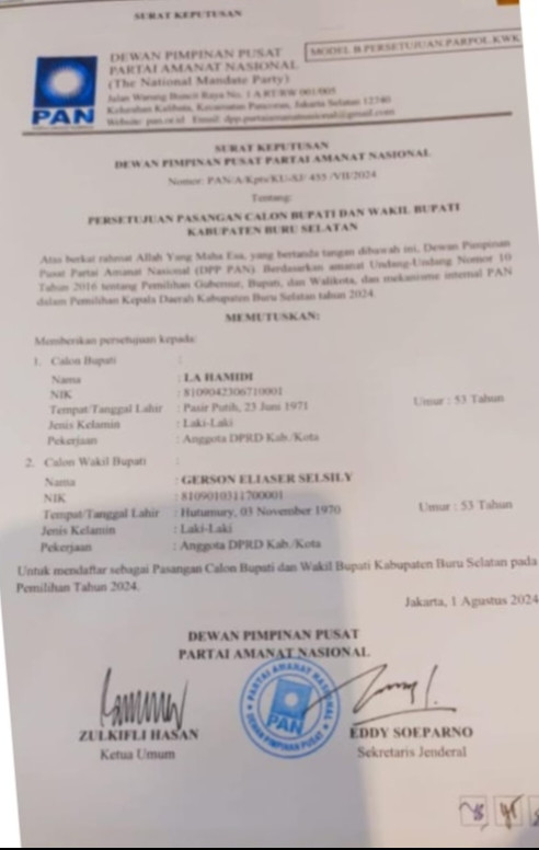 "Benar (SK PAN) untuk Pilkada Kabupaten Buru Selatan 2024 diberikan ke, Lahamidi dan Gerson Eliaser Selsily (LHM-GES) untuk maju di Pilkada Bursel tahun 2024," kata Ketua DPD PAN Kabupaten Bursel, Ahmadan Loilatu kepada pers saat di hubungi via telepon selulernya, kemarin.