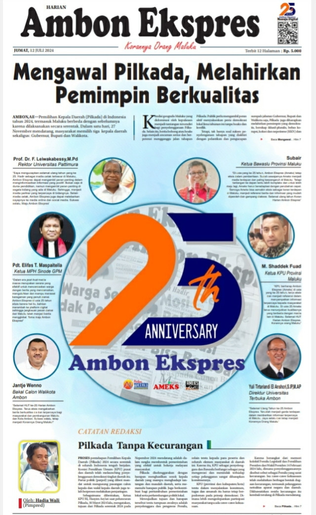 Harian Ambon Ekspres sebagai salah satu media arus utama, yang hari ini Jumat, (12/7), telah berulang tahun ke-25 punya catatan tersendiri terkait pelaksanaan Pilkada di Maluku sebelum-sebelumnya. Dan pada Pilkada 2024 ini, Ambon Ekspres akan memberikan ruang signifikan dalam penyebaran informasi seputar pelaksanaan Pilkada. Harapannya ruang tersebut dapat dimanfaatkan publik melakukan pengawasan secara moral terkait pelaksanaan Pilkada di bumi raja raja ini.